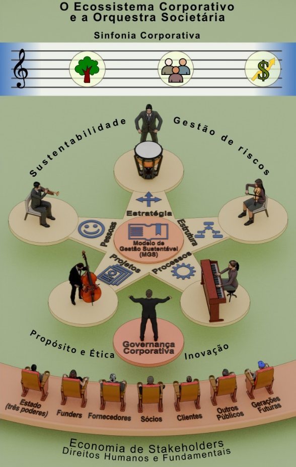 Estas e outras indagações permitem direcionar países, empresas, profissionais, cidadãos, famílias à implantação das melhores práticas do Modelo de Gestão Sustentável (MGS), centro neural da Orquestra Societária, figura a seguir relacionada ao nome desta coluna, que combinam, nesta era de transformações exponenciais, regras de crescimento sustentável, com maior humanidade, fiscalização, controle e ações concretas nas áreas mais suscetíveis sociais e de eventos extremos.