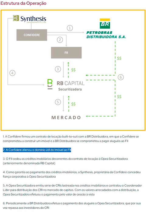 Para entendermos como esse imbróglio se formou, é necessário retornarmos às origens da operação. Em outubro de 2012, a RB Capital, atual Opea, publicou prospecto anunciando uma oferta pública de distribuição dos certificados de recebíveis imobiliários (CRIs) lastreados em créditos provenientes de contrato atípico de locação firmado entre a incorporadora Confidere, como locadora, e Petrobras Distribuidora S/A, a locatária. O prospecto informou também que a locação seria referente a uma edificação construída sob medida, atendendo às especificações ditadas pela então Petrobrás Distribuidora para se tornar a sede administrativa desta. Chamou, ainda, a atenção para o fato de que estes certificados consistem em “títulos de renda fixa no mercado de capitais com fiscalização da CVM”. Mas, considero como ponto mais relevante, a descrição da estrutura da operação, nela a securitizadora RB Capital (Opea) assevera que “Por meio do Compromisso de Venda e Compra, a Confidere se comprometeu a alienar o domínio útil dos Imóveis ao Fundo”. O Fundo, no caso, é o FII Cidade Nova, que foi preparado especificamente para esta operação.